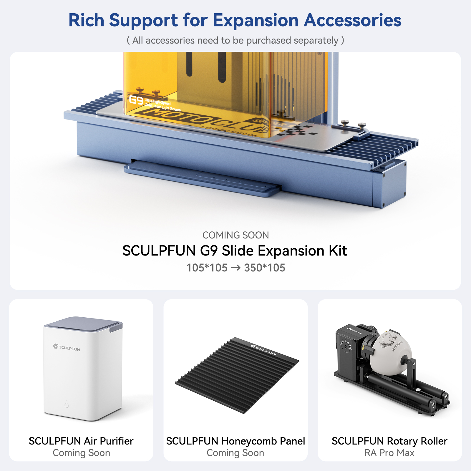 It can be compatible with Air Purifier, G9 Slide Extension Kit and RA Pro Max rotary roller attachments to unlock more possibilities. Paired with the air purifier allows for about 99.97% smoke purification, bringing a more secure working environment to you. The slide extension kit will expand your work area by up to 3.5 times, perfect for batch processing and larger engraving projects. RA Pro Max is a 4-in-1 rotary including roller and chuck for most of the daily use of cylinders and spheres, such as glasses, mugs, baseballs, rings, etc.