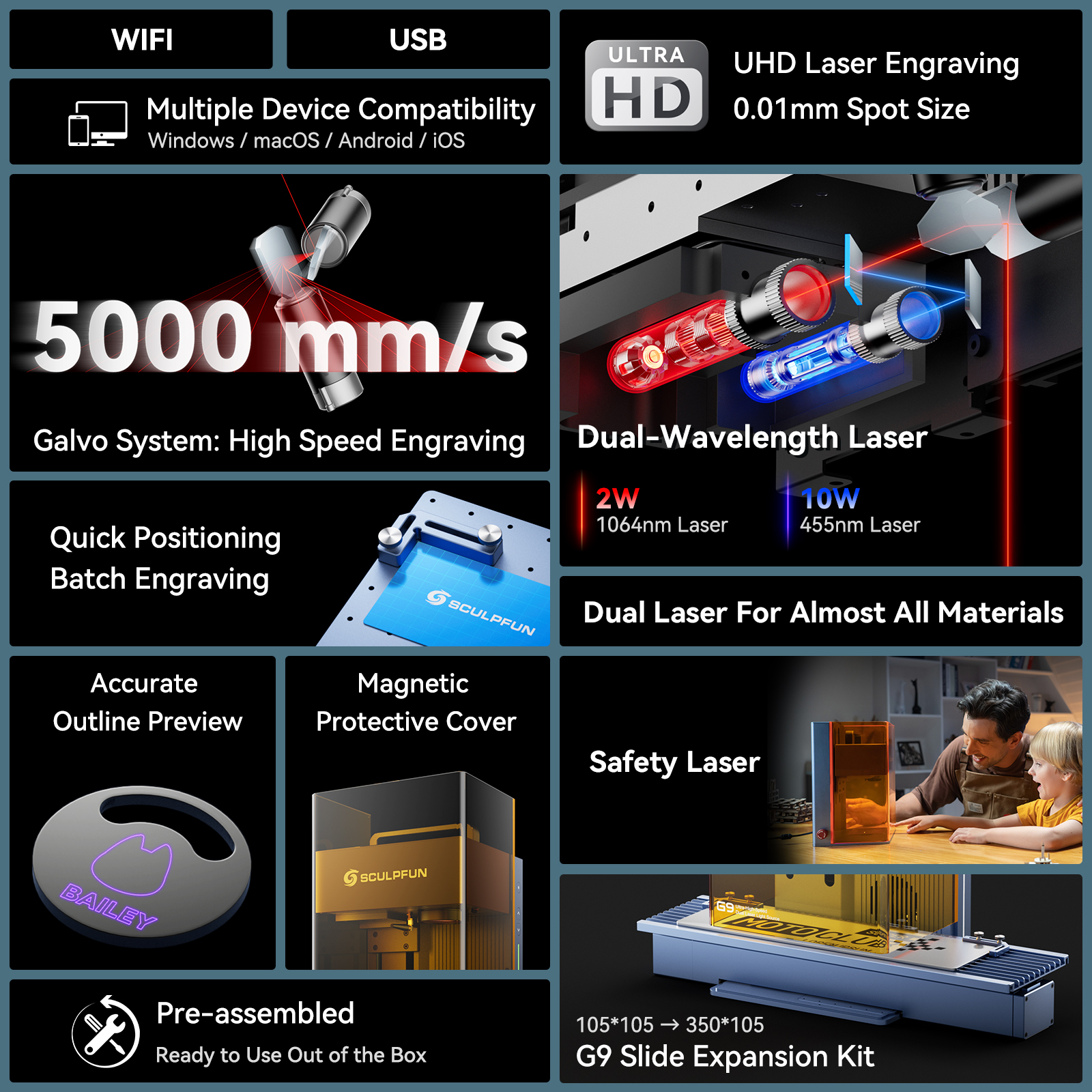 SCULPFUN G9 Infrared+Diode Blue Dual Laser Engraver Ultra High Speed Lightning Engraving 2-In-1 Laser Marking Machine Complies with Class I Standards for Metal Plastic Jewelry Leather