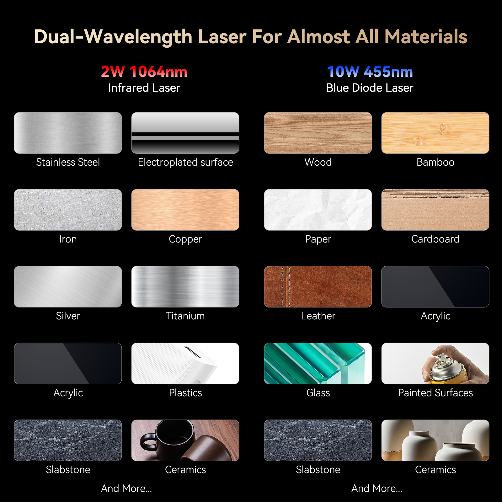Two wavelengths of laser source is designed in the Sculpfun G9. A Infrared Laser and A Diode Blue Laser make it can work on almost all materials. The 2W 1064nm infrared laser can perform its exceptional ability of metals and plastics engraving, expanding the range of materials to be engraved. The 10W 455nm diode blue laser is suitable to engrave the most common materials such as wood, acrylic, etc. Thus you can use this engraving machine to customize business cards, dog tags, remove rust and so on.