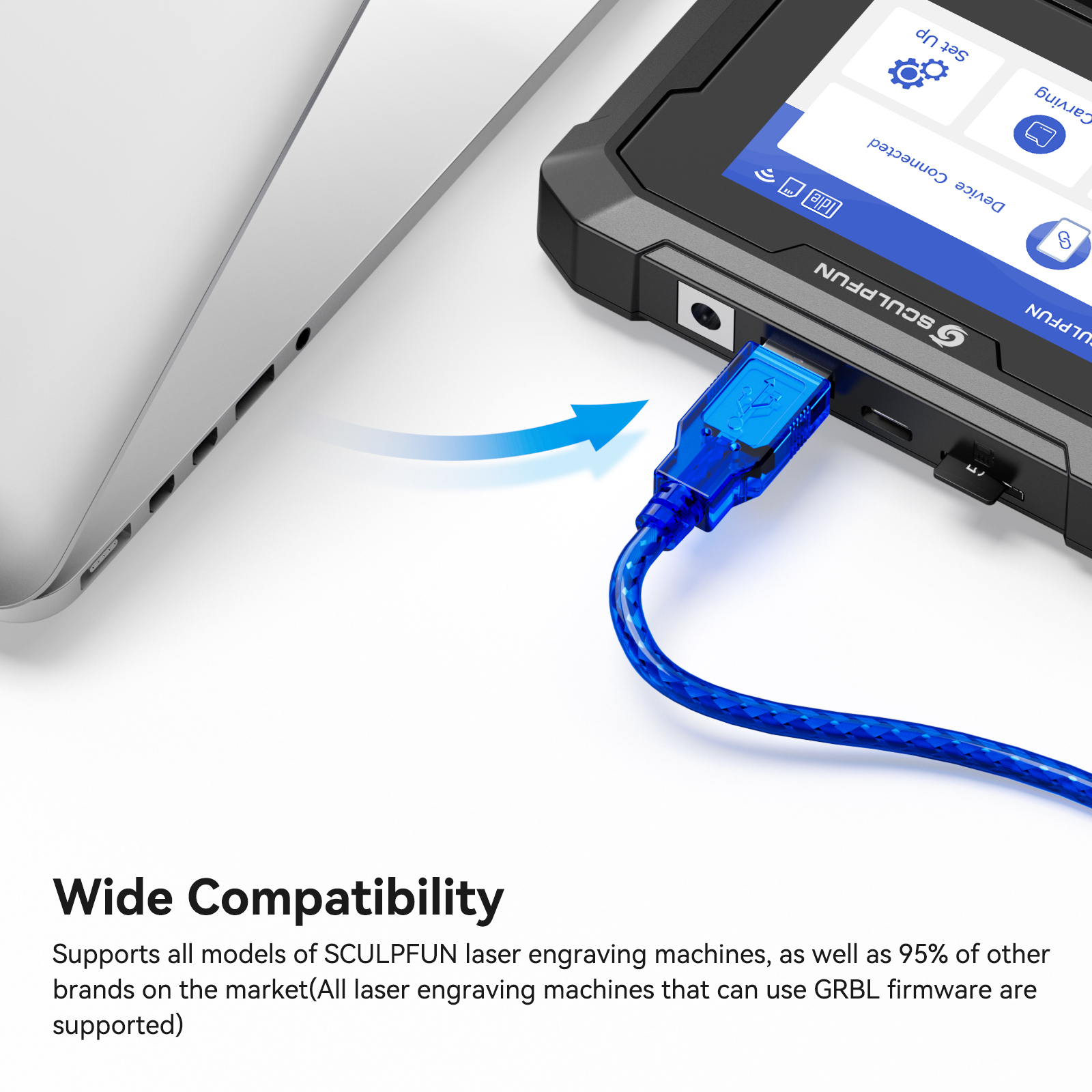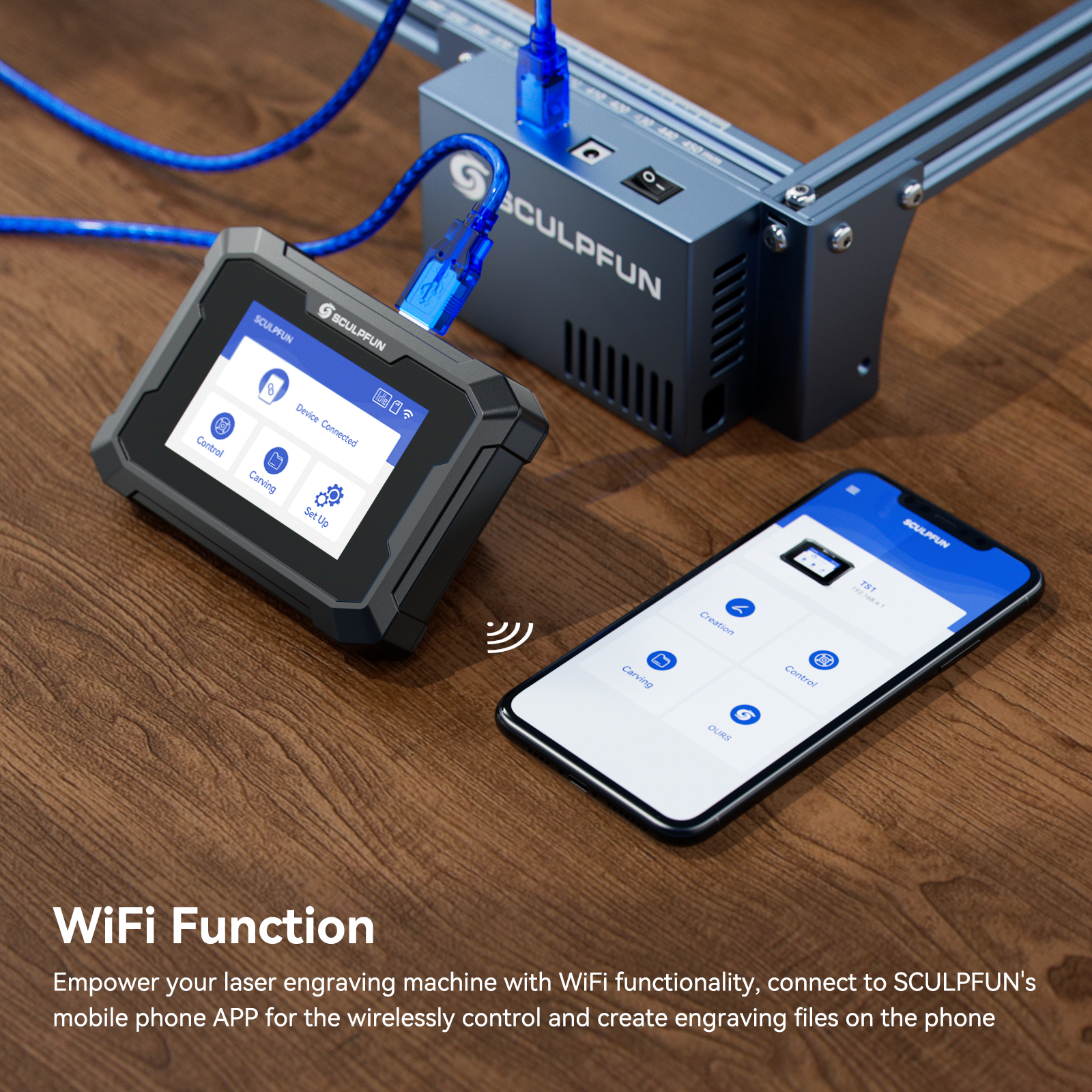 2. WiFi Connection: SCULPFUN TS1 touch screen can empower the different brands of laser engravers to get WiFi function, which can realize the functionality of real-time slicing without the need of computers when used with SCULPFUN mobile APP, making it easy and quick.